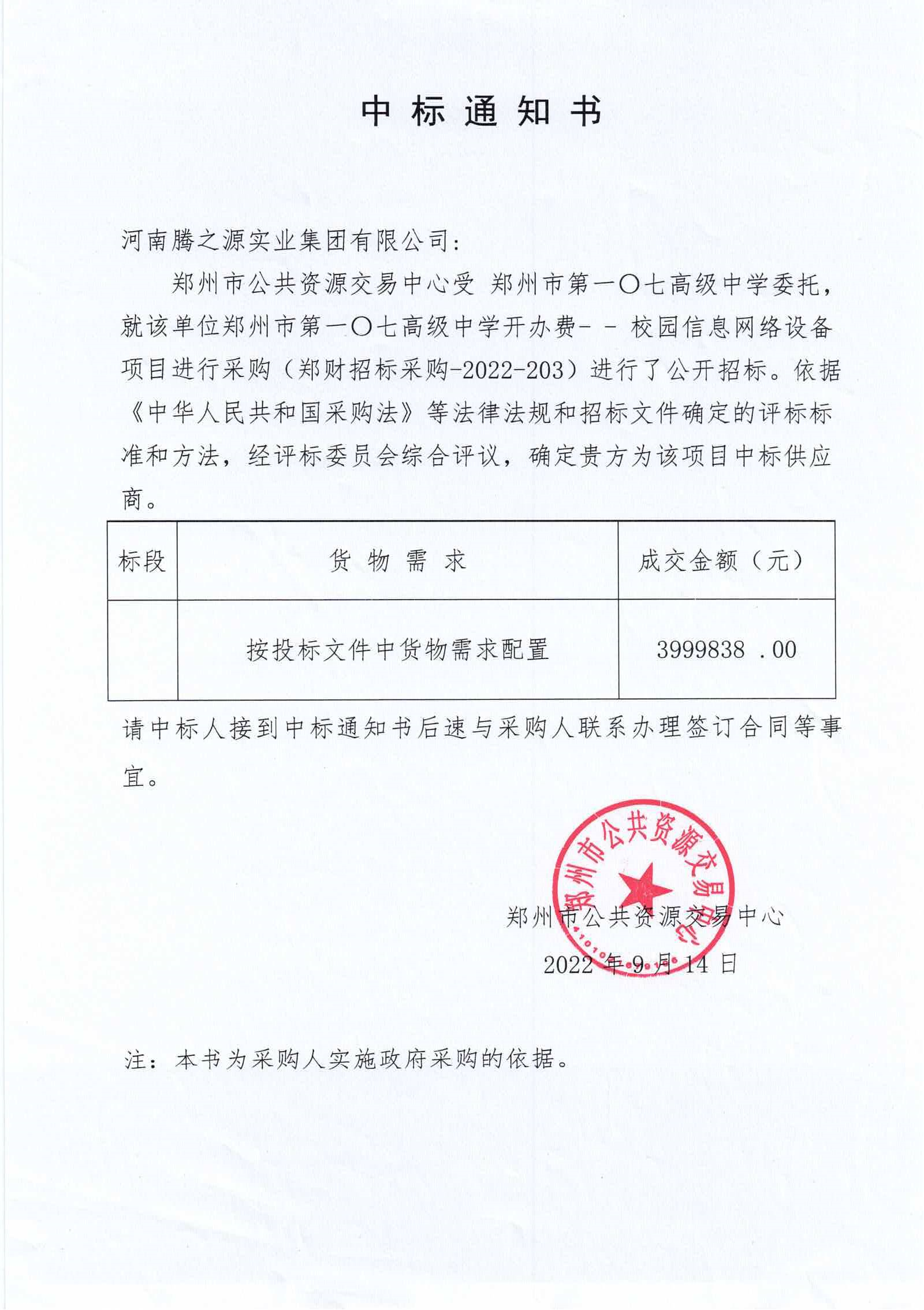 2022年9月14日,尊龙凯时·[中国区]人生就是搏! 喜迎来“郑州市第一〇七高级中学开办费-校园信息网络设备项目”的中标喜讯!中标金额3,999,838.00元人民币,在公司的业绩辉煌史上又添了浓墨重彩的一笔!