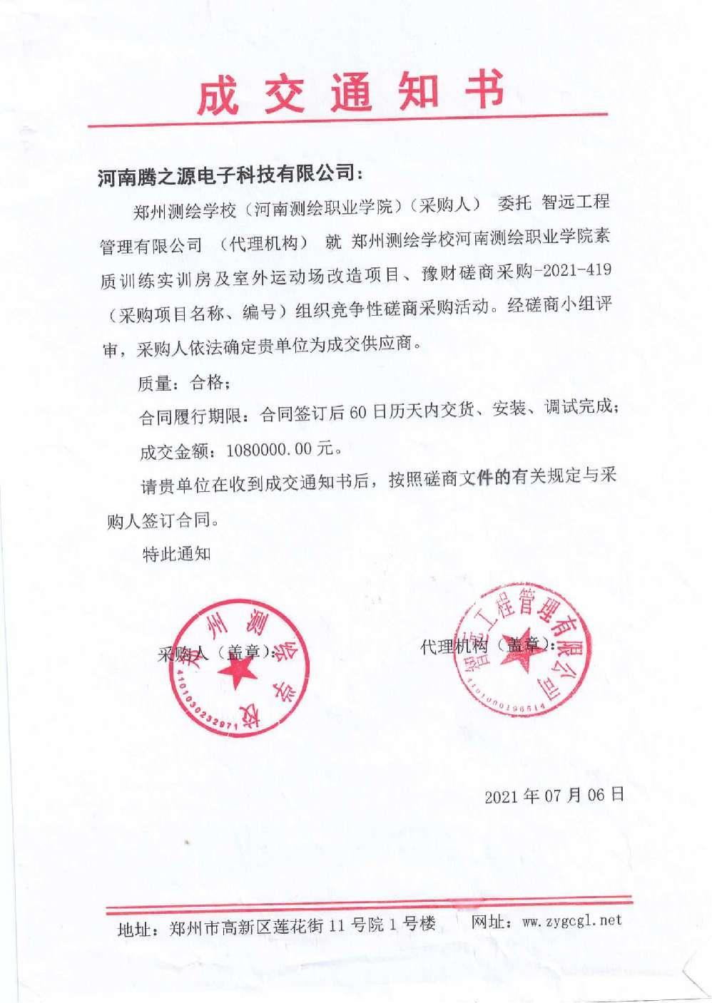 2022年1月27日,经过将近一个月的投标文件准备,在郑州测绘学校河南测绘职业学院数字训练实训房及室外运动场改造项目中,尊龙凯时·[中国区]人生就是搏! 以1080000.00元人民币的价格,过硬的资质、专业的技术团队、合理的竞争价格以及完善的售后服务体系在一众竞标公司中脱颖而出,获得了该项目的中标资格!