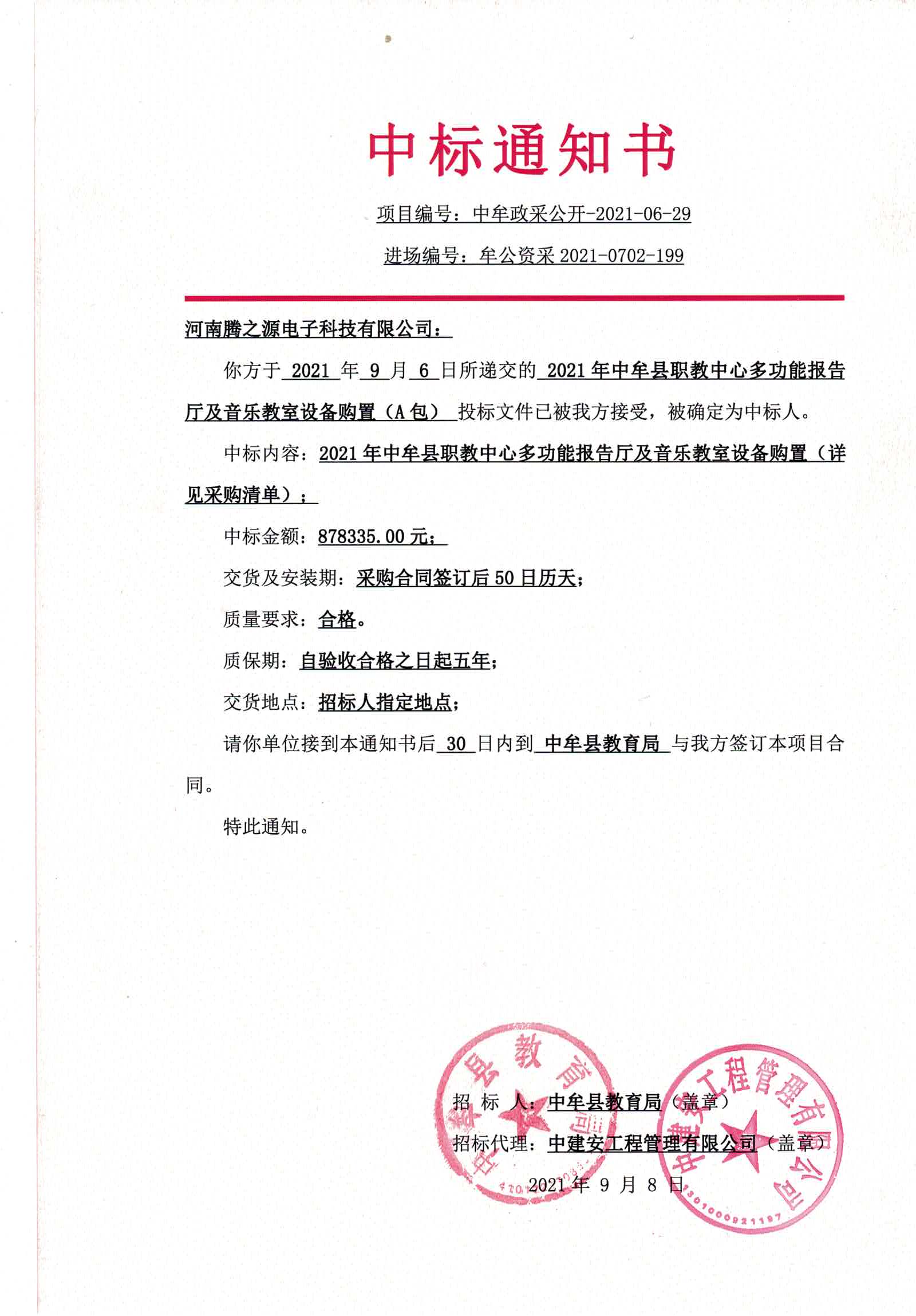 主要阐述了“2021年中牟县职教中心多功能报告厅及音乐教室设备购置(A包)”项目的中标情况。