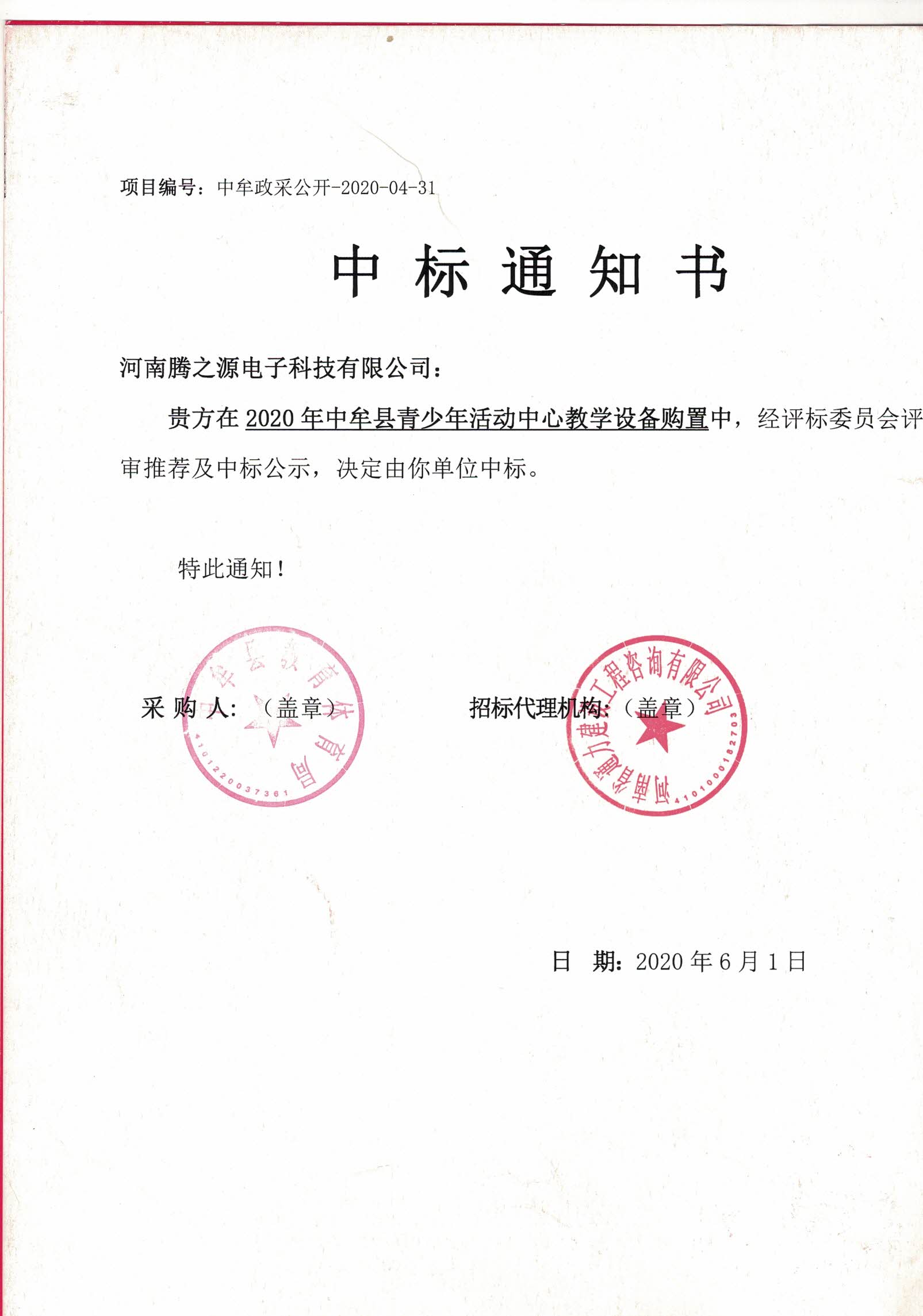 主要描述了“2020年中牟县青少年活动中心教学设备购置”项目的中标情况。
