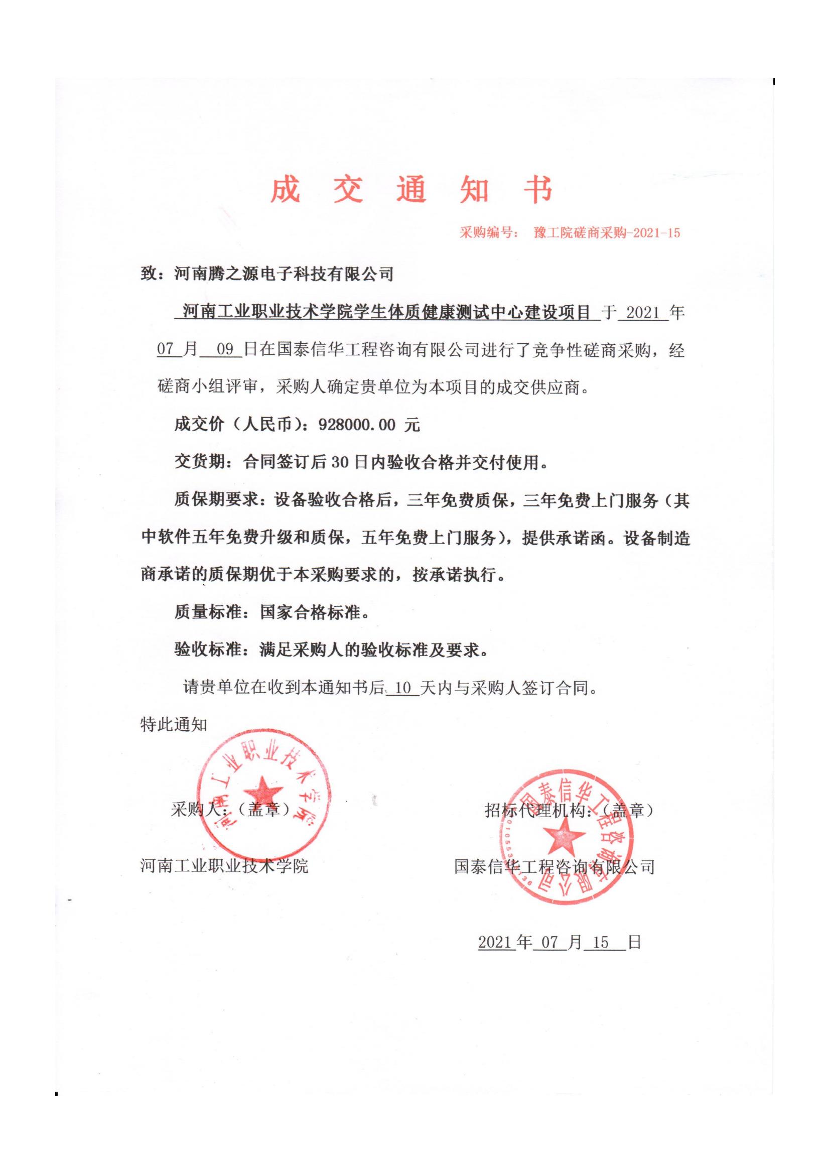 本文主要阐述了“河南工业职业技术学院学生体质健康检测中心建设项目”的中标情况。