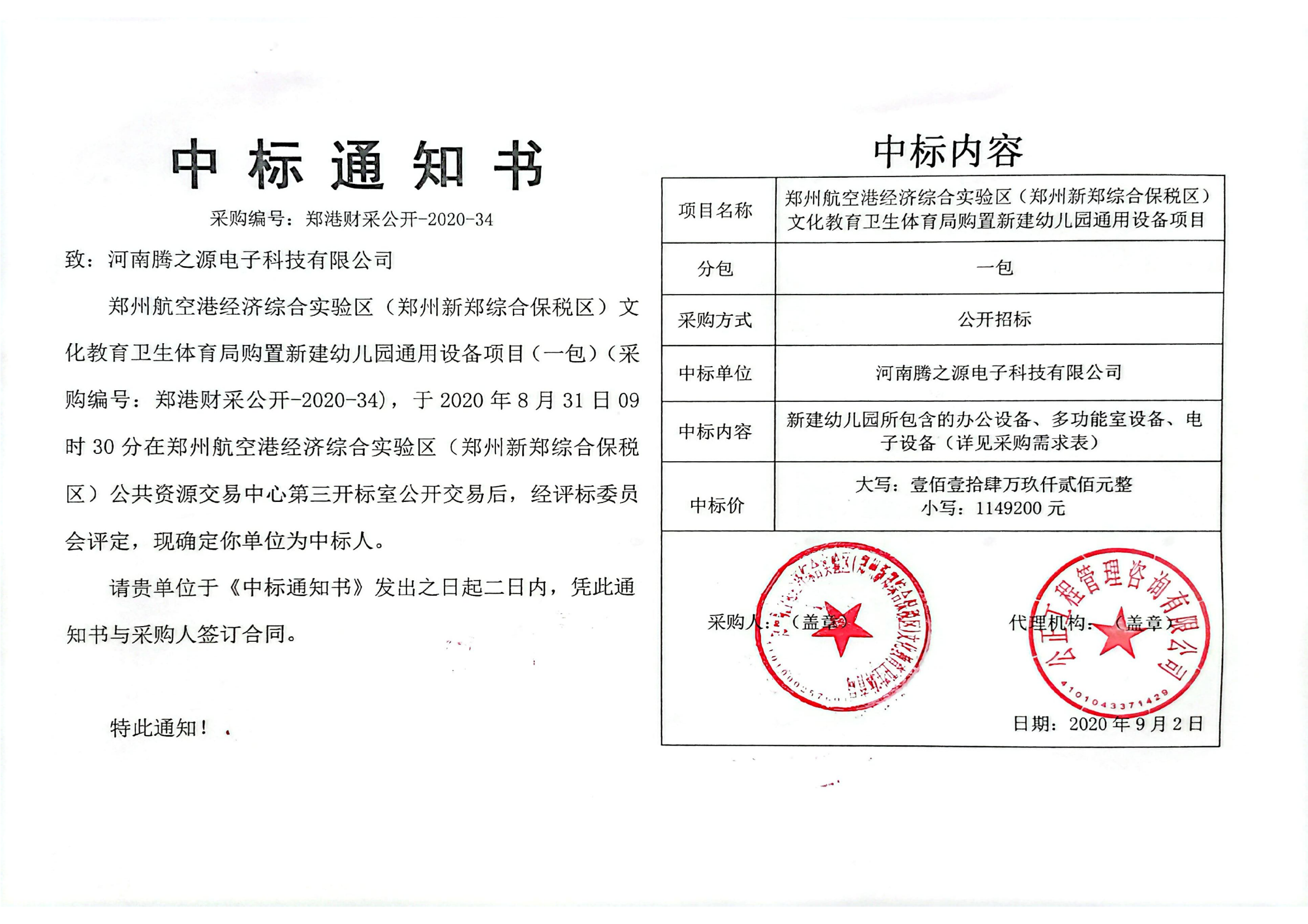 2020年09月02日,尊龙凯时·[中国区]人生就是搏! 喜迎来“郑州航空港经济综合试验区(郑州新郑综合保税区)文化教育卫生体育局购置新建幼儿园通用设备项目”的中标喜讯!中标金额1149200.00元人民币,在公司的业绩辉煌史上又添了浓墨重彩的一笔!